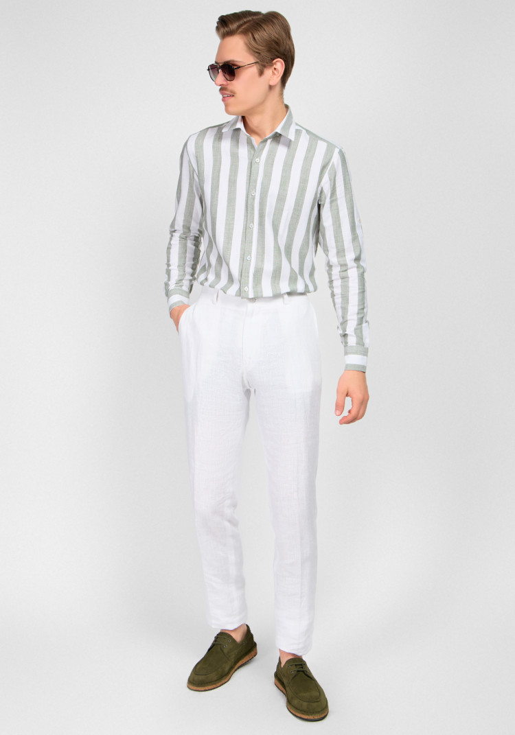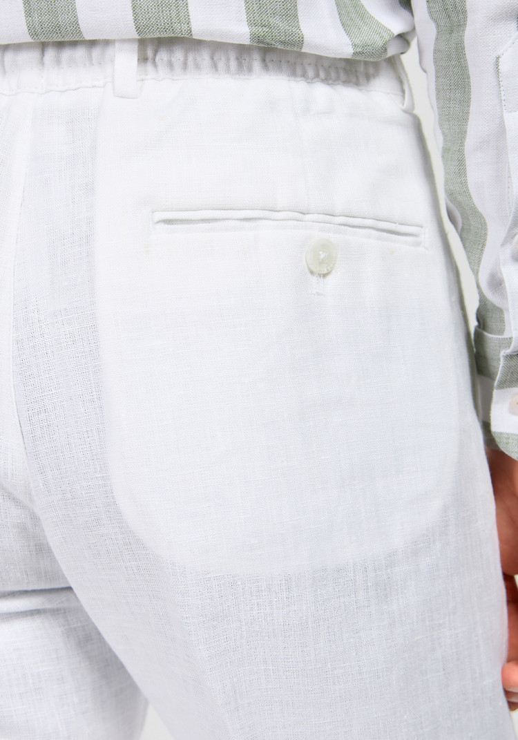 Чоловічі білі однотонні лляні брюки - справжня знахідка для тих, хто цінує якість і мінімалізм. Легкі та дихаючі, вони ідеально підійдуть для спекотних днів або вечірніх прогулянок. Поєднуйте їх з улюбленою сорочкою або футболкою, і ви завжди будете у центрі уваги.