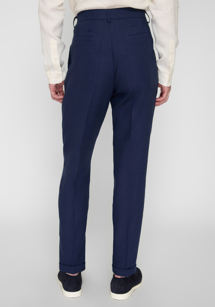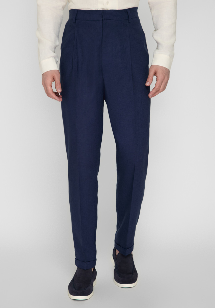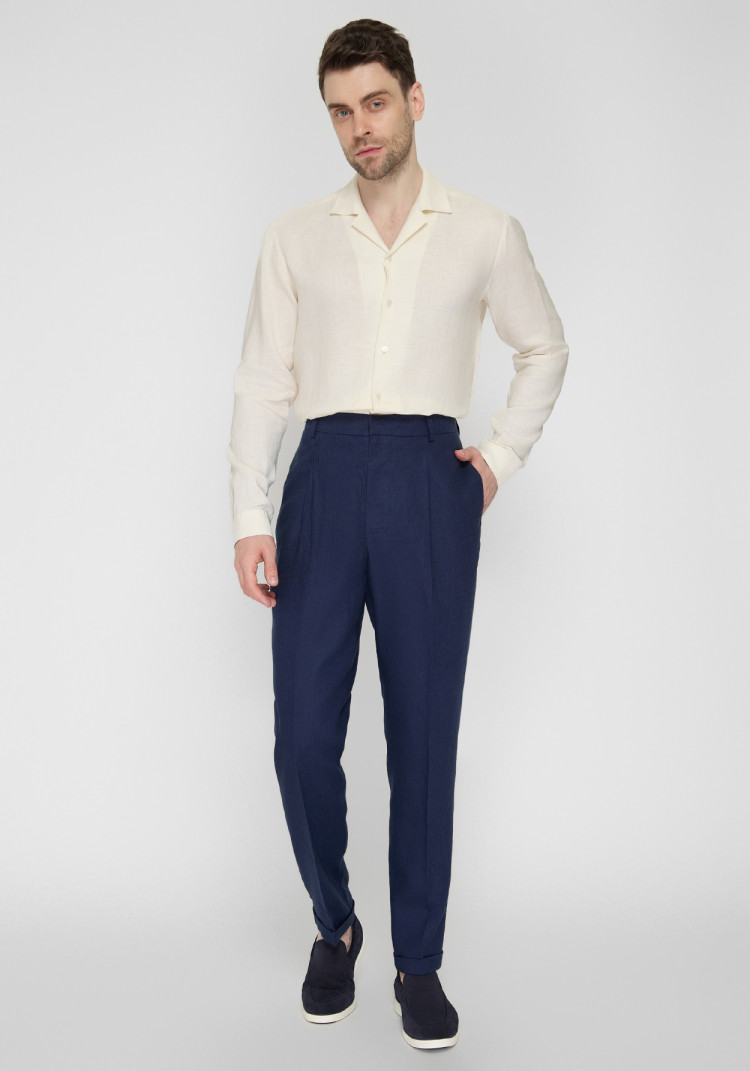 Чоловічі брюки темно-синього кольору з лляного матеріалу - ідеальний вибір для літнього сезону. Лляна тканина забезпечує приємне відчуття свіжості та комфорту, дозволяючи шкірі дихати в спекотну погоду. Темно-синій відтінок додає класичного шарму та робить ці брюки універсальними для будь-яких образів - від офісного стилю до відпочинку на природі. Широкий діапазон силуетів і фасонів дозволяє підібрати варіант, що ідеально пасує до вашого стилю та забезпечить зручність протягом усього дня.