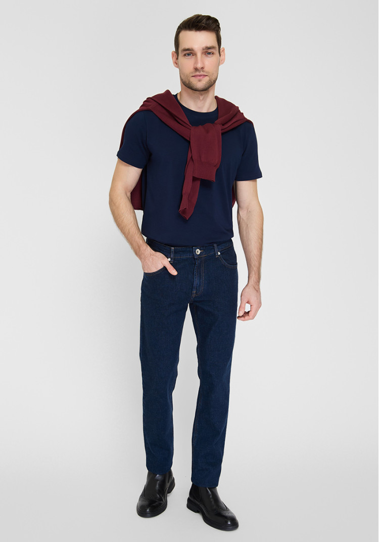 Темно-синій колір джинсів не вибагливий у догляді і поєднується практично з усім. Придивись до аксесуарів: шкіряний ремінь або стильні мокасини вдало завершать образ.