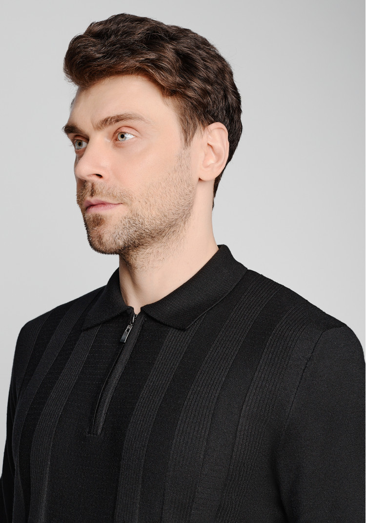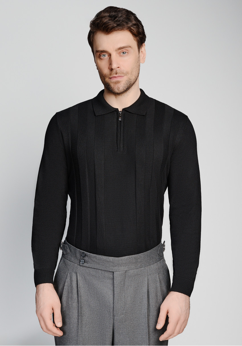 Чорне поло в рубчик на блискавці стане чудовим вибором для холодних днів. З бавовни, з ноткою кашеміру та полібутилену, воно підлаштується під твої активні плани, будь то прогулянка парком чи зустріч з друзями в місті.