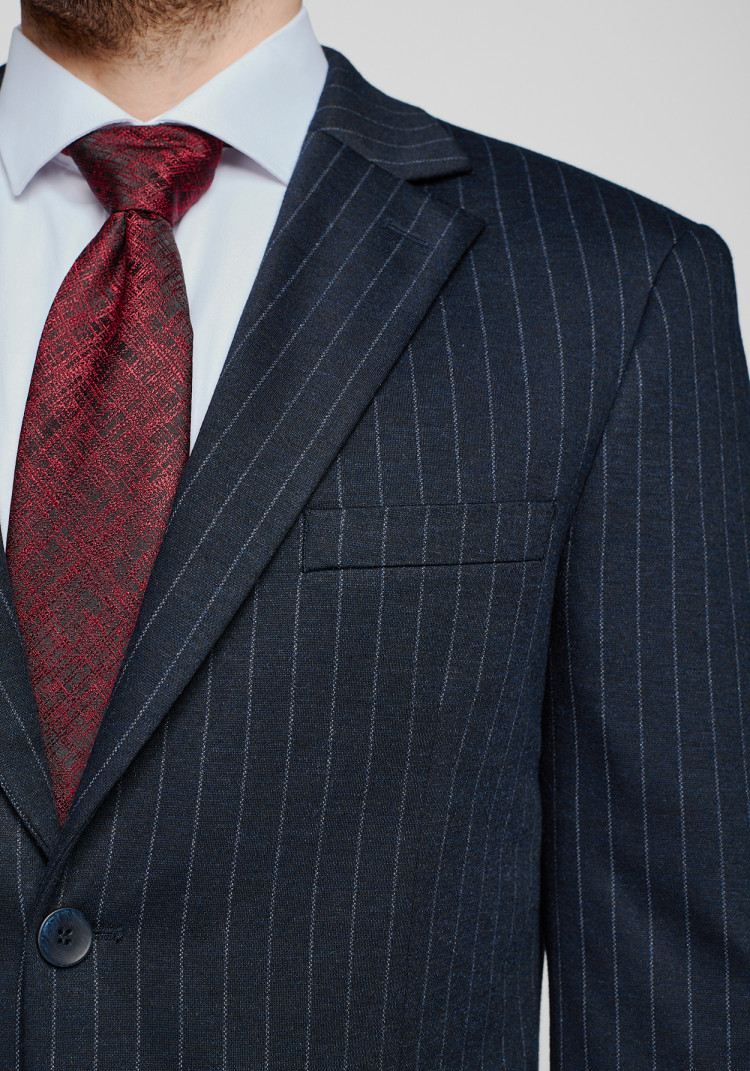 Темно-сірий костюм у смужку - те, що потрібно для важливих переговорів чи святкових подій. Завдяки приталеному крою, він підкреслює статуру, а класична однообортна двійка додає стриманості й стилю. Костюм темно-синій, з прямокутним лацканом та накладними кишенями, виконаний з комбінації вовни, поліестеру, віскози та трохи еластану - ідеальний на будь-який сезон.