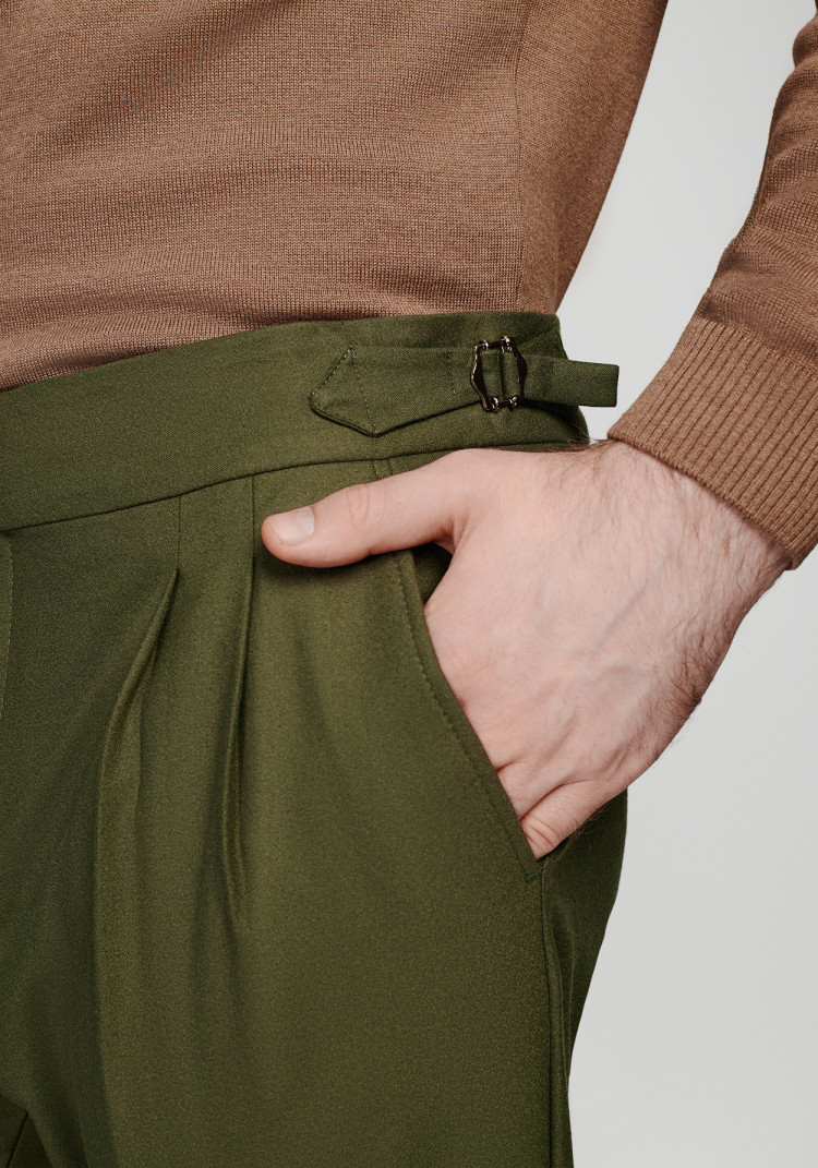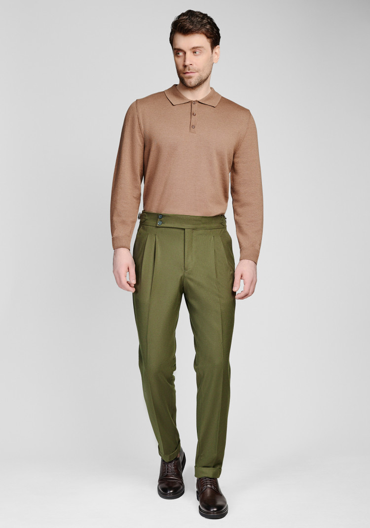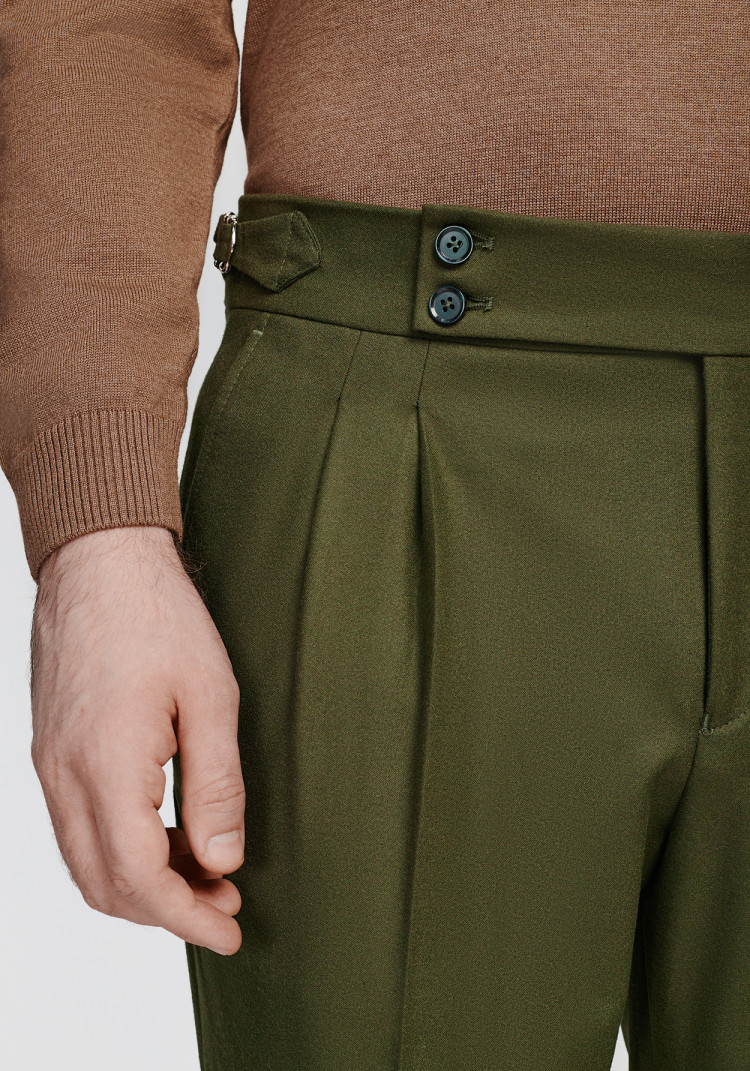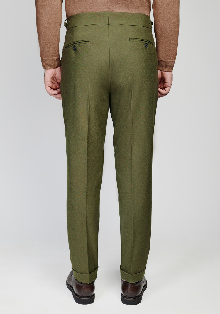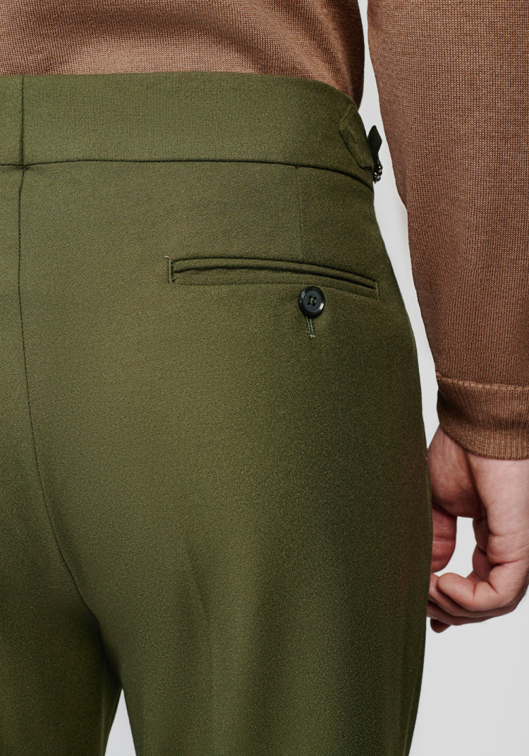 Класичні чоловічі брюки темно-зеленого кольору стануть гарним доповненням стильного образу. Вони створені з урахуванням всіх сезонів, бо їхній комбінований склад з вовни, поліестеру, віскози та еластану забезпечує комфорт у будь-яку погоду.