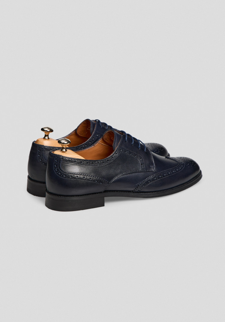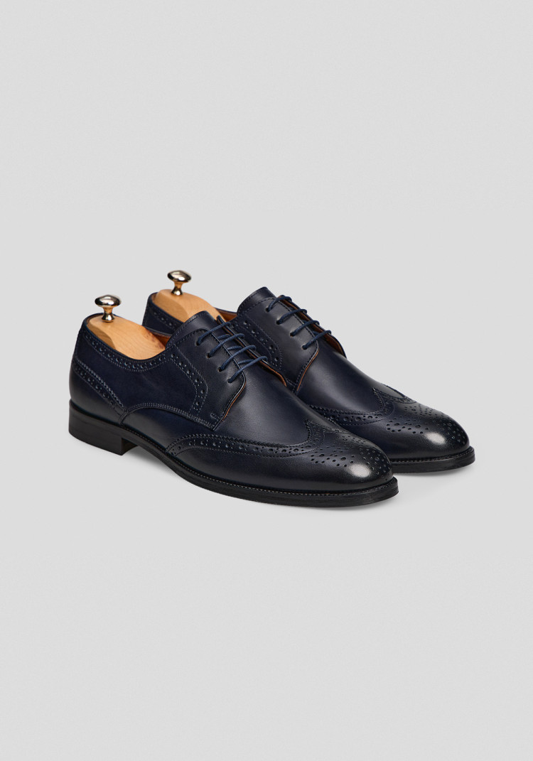 Сині броговані дербі ідеально підходять для будь-якого сезону завдяки натуральній телячій шкірі, ці дербі виглядають чудово як з діловим костюмом для важливих зустрічей, так і з джинсами для вечірки з друзями.
