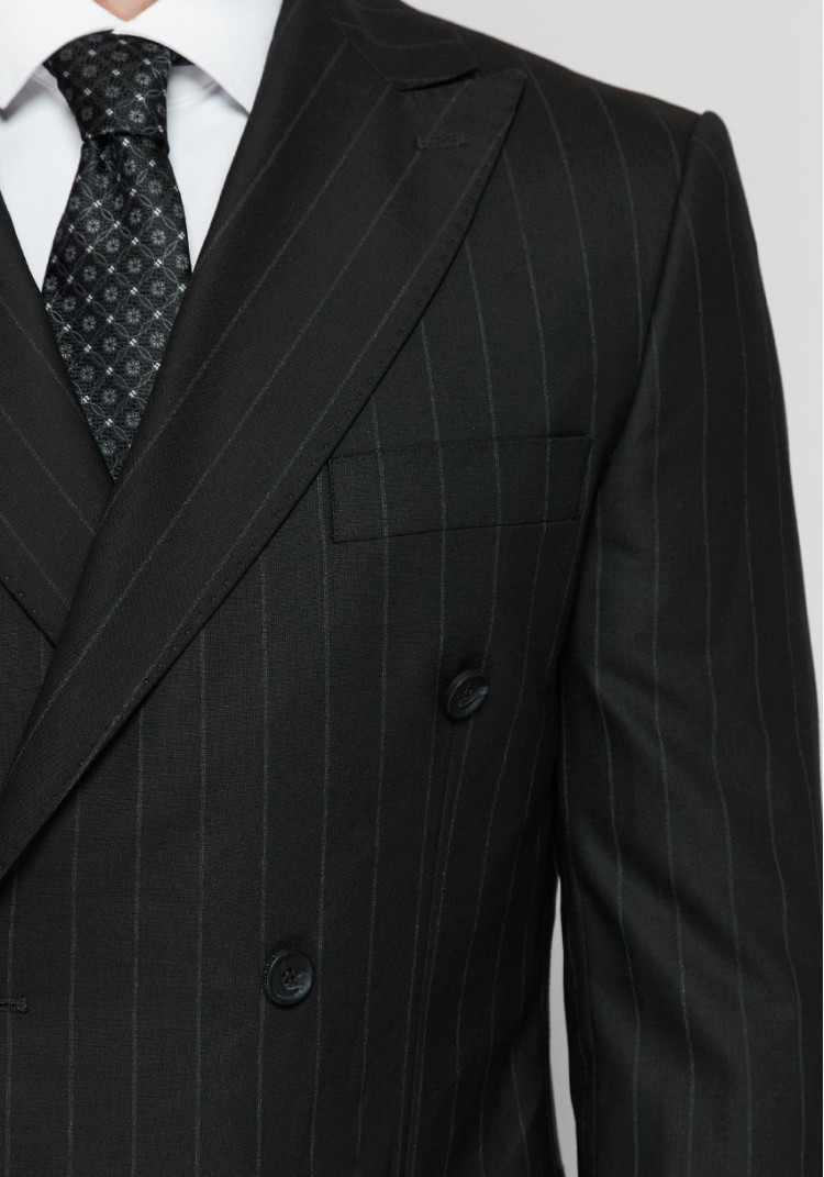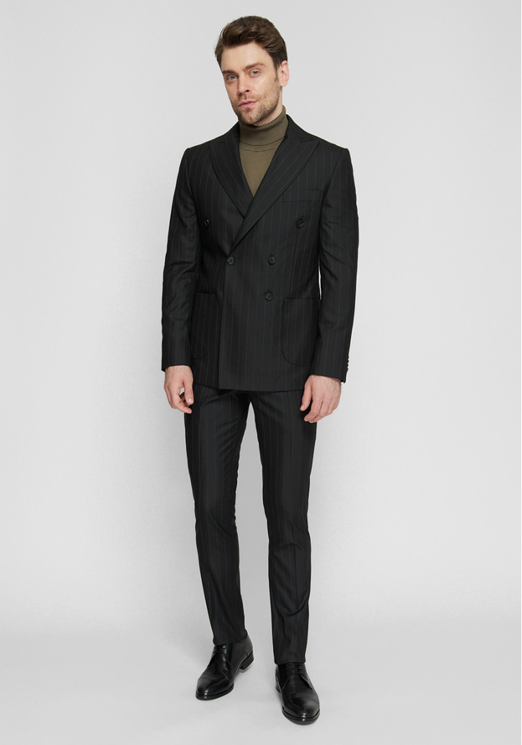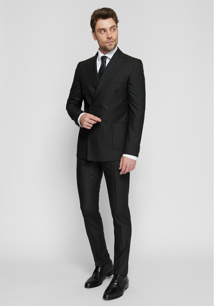Чоловічий костюм двобортний чорний в смужку - вираз розкіші та класики. Чорний колір завжди в тренді, а смужка надає йому особливого шарму. Двобортний фасон з дубльованими рядами ґудзиків - це ознака вишуканості та стилю. Цей костюм ідеальний для формальних заходів, вечірок чи важливих подій. Він підкреслить вашу елегантність та бездоганний смак. В цьому образі ви будете виглядати як справжній джентльмен, готовий завоювати будь-яку аудиторію.