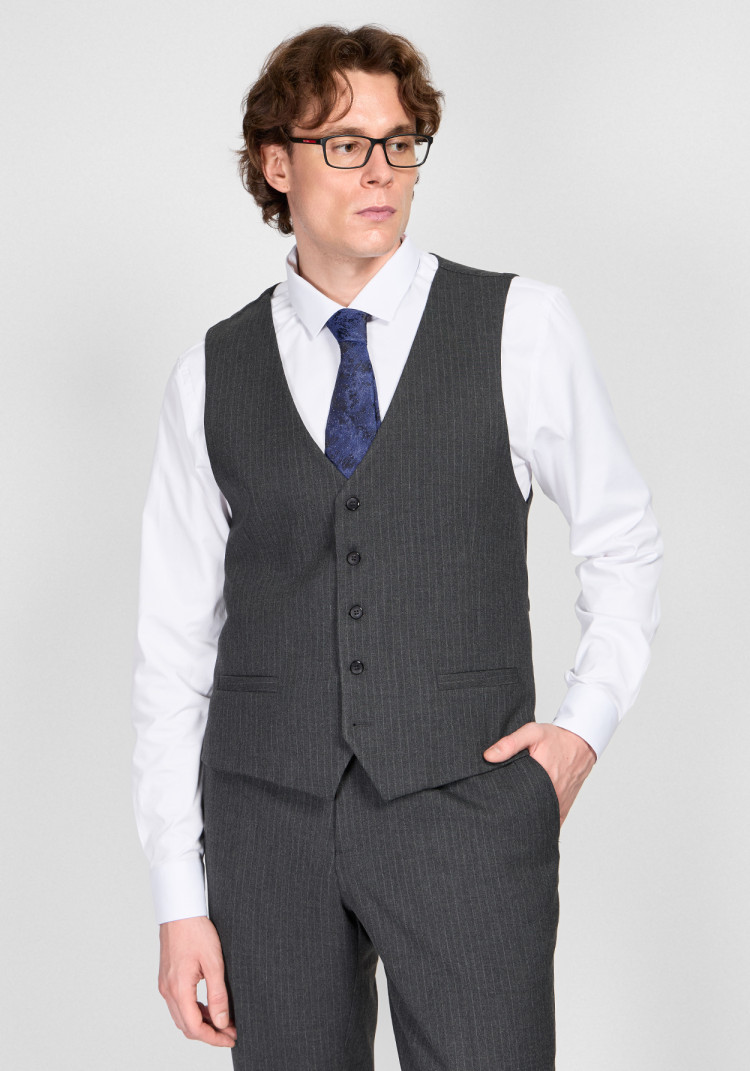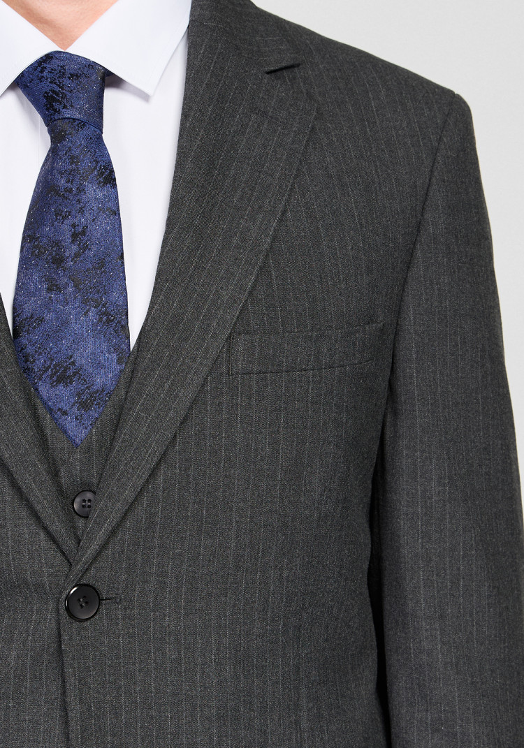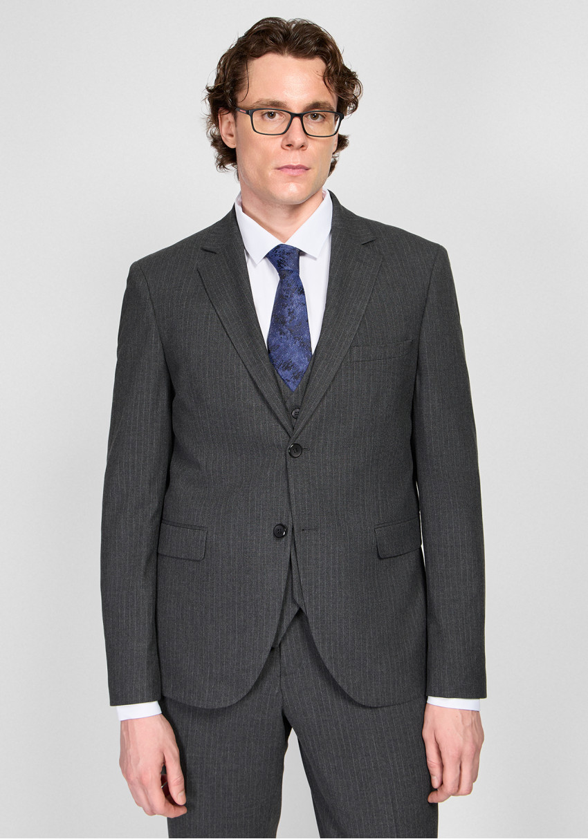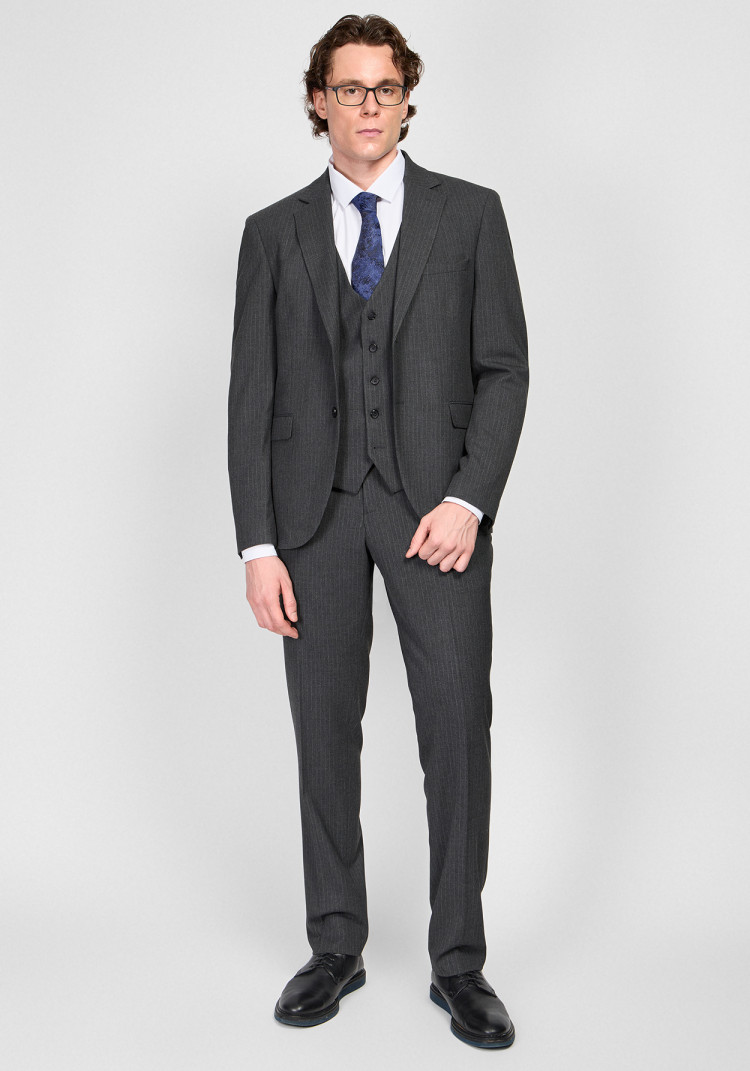 КЛАСИЧНИЙ ЧОЛОВІЧИЙ КОСТЮМ ТРІЙКА ОДНОБОРТНИЙ ТЕМНО-СІРИЙ В СМУЖКУ