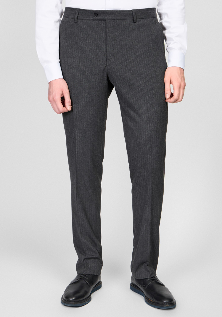 Костюм темно-сірий в смужку чудовий вибір для будь-якого сезону. Якщо у твоєму календарі планується важлива зустріч чи урочистий захід, цей костюм стане надійним компаньйоном. Його притаманний приталений крій забезпечить елегантний вигляд, а комбінація з вовни, поліестеру, віскози та еластану гарантує комфорт.