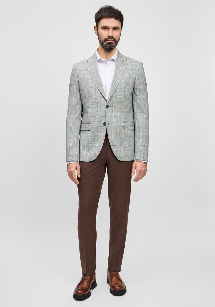 Приталений крій класичного сірого піджака в зелену клітинку підкреслить твою фігуру, а прямокутні лацкани додадуть нотки класики. Якщо говорити про матеріали, то тут все на вищому рівні: комбінація вовни, поліестеру, віскози та еластану забезпечує комфорт у будь-яку пору року.